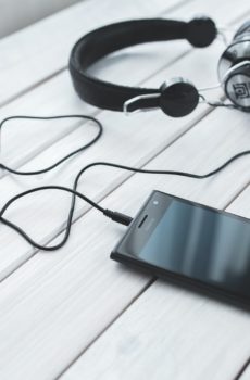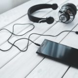 black smartphone and headphones on a desk